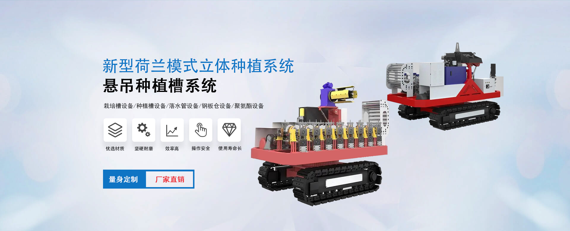 雄博機(jī)械主營(yíng):種植槽設(shè)備/栽培槽設(shè)備/草莓栽培槽/新型立體種植槽/草莓無土栽培設(shè)備/草莓立體種植系統(tǒng)/懸吊種植槽系統(tǒng)/落水管設(shè)備/鋼板倉設(shè)備/聚氨酯設(shè)備等。