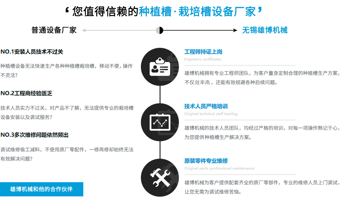 您在選擇雄博產(chǎn)品的同時(shí),也選擇無微不至的終身服務(wù)。可根據(jù)不同客戶實(shí)際需求進(jìn)行種植槽設(shè)備,栽培槽設(shè)備等的特殊工藝設(shè)計(jì)制造專業(yè)一對(duì)一售前/售后/技術(shù)咨詢指導(dǎo),享受更貼心/放心的設(shè)備使用體驗(yàn)。